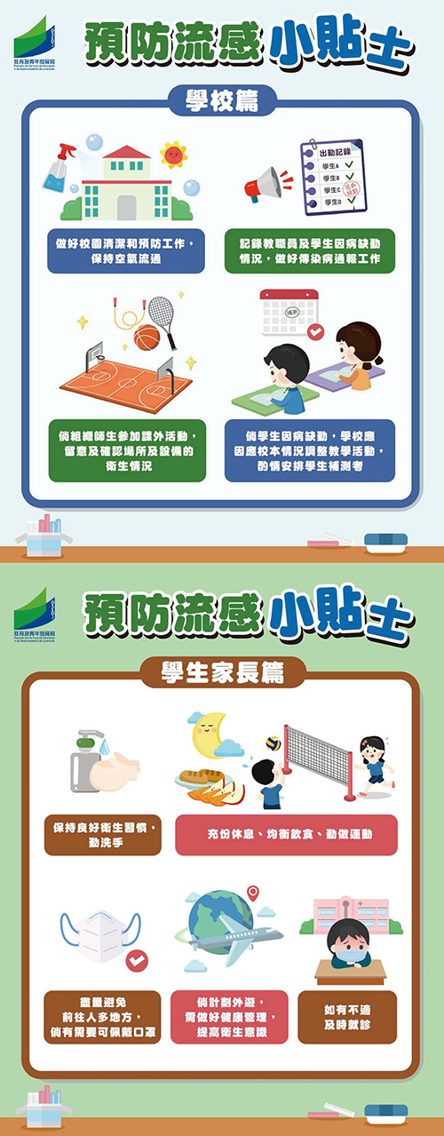 學校方面,教青局代局長黃嘉祺表示,隨著流感季節及春節假期將至,局方將與全澳學校舉行會議,提醒學校做好校園清潔和預防工作,保持校園環境衛生清潔及空氣流通,加強健康教育。同時提醒學校持續了解春節假期前後學生的身體情況,而家長亦須時刻留意子女的身體狀況,尤其新春假期計劃外遊時,須注意提高衛生意識,如有不適應盡快就診及留在家中休息,及時通知學校子女的情況。此外,教青局與衛生局建立緊密的通報機制,以盡早發現和控制校內傳染病的群集性感染事件,並向學校提供各方面的支援;每年與衛生局協作到校園為學生提供流感疫苗接種;教青局與學校領導及健康促進人員日常亦保持緊密溝通,推動在學校開展健康教育和活動,與學校各持分者共同營造健康校園,促進學生健康成長。