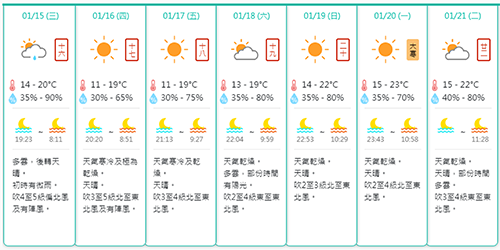 根據氣象局七日天氣預報,今日多雲,後轉天晴, 初時有微雨,最高氣溫約為 20℃, 晚間氣溫將下降至最低約14℃,吹4至5級偏北風及有陣風, 相對濕度介乎35%至90%之間。週四及週五天晴,天氣寒冷及極為乾燥,氣溫料11℃至19℃,吹3至5級北至東北風及有陣風。週六及週日最低氣溫將回升至13℃和14℃。