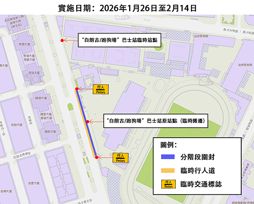 配合施工需要,今日日間路線首班車起,“白朗古/跑狗場”巴士站將往青洲大馬路方向臨時遷移約100米,供1(往媽閣)、5X(往皇朝)、23(往旅遊塔)、25B(往橫琴澳方口岸)、33(往筷子基)及N1B(往亞馬喇前地)路線乘客上落,至2月14日首階段有蓋行人道工程完成後將遷回原位。同時,原巴士站及相關區域將設為臨時行人道。