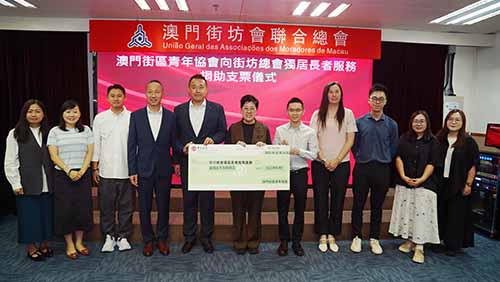 為響應並支持街坊總會推動的獨居老人服務賣旗籌款活動,澳門街區青年協會於昨日下午向街坊總會捐助善款12,900澳門元,由會長顏奕恆,理事長陳偉良,監事長鄧文基及一眾理監事代表致送善款支票,並由街坊總會會長吳小麗,副理事長林敏芝、林家全、程順明等代表接收。