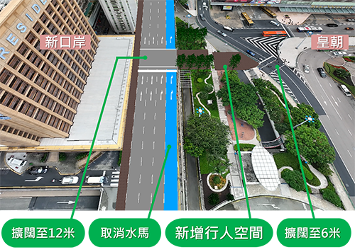 新口岸廣州街與城市日大馬路之間此前因道路環境限制,欠缺正式行人路,當行人欲從城市日大馬路或廣州街一帶往返新口岸及皇朝區時,需繞行設於友誼大馬路近藝園一側以注水膠壆(水馬)分隔的臨時通道。為此,當局決定對藝園內設施進行重整,新增行人空間,打造便捷通道,分別將友誼大馬路近藝園一側人行橫道擴闊至12米,及將近仙德麗街一側的人行橫道擴闊至6米,讓行人可透過順直的步行動線及舒適的過路環境橫越友誼大馬路及仙德麗街。另外,工程亦一併取消友誼大馬路近藝園的水馬以實施四線行車,優化友誼大馬路的行車環境。