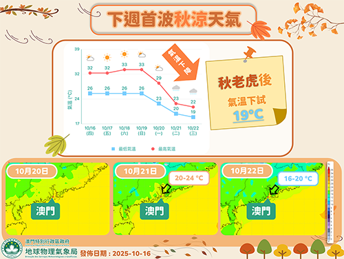 【本報訊】踏入10月中下旬,本澳天氣仍然炎熱,但隨著近期東北季風開始轉趨活躍,氣象局預料下週氣溫有所下降,下週二及週三最低氣溫或降至19℃至20℃。