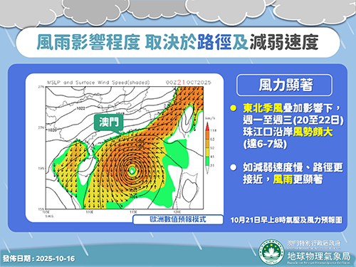 氣象局指,在強烈東北季風及潛在熱帶氣旋共同影響下,下週一至週三(20至22日)本澳風勢頗大,間中有驟雨。如該潛在熱帶氣旋減弱速度較慢且路徑更接近本澳後才轉向,對本澳造成之風雨影響程度將更為顯著。