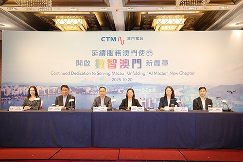 澳門電訊昨日下午舉行“延續服務澳門使命 開啟數智澳門新願景”新聞發佈會,該公司執行委員會成員包括商務副總裁湛寶儀、網絡服務副總裁伍時耀、財務副總裁關頴、資訊科技副總裁許國苗、客戶服務副總裁劉健國、企業傳訊總監兼執行委員會秘書陳靜儀列席,藉公司昨日迎來成立44周年之際,宣佈一次性全方位通訊服務減免方案詳情,並介紹澳門電訊聚焦AI、大數據等應用發展規劃。