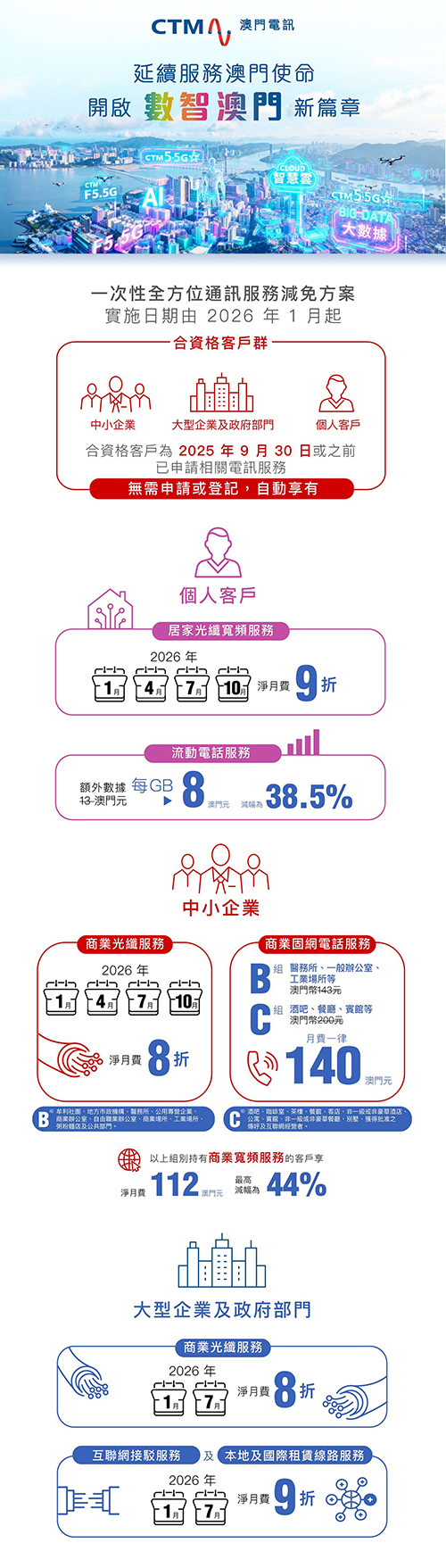 據介紹,為支持政府營造更好的營商環境及增加市民獲得感,經與郵電局協商,澳門電訊將推出一次性全方位通訊服務減免方案,受惠對象為2025年9月30日或之前已經申請澳門電訊相關服務之用戶,包括中小企、大型企業、政府部門及個人客戶,合資格中小企客戶之一般商業光纖寬頻服務可於2026年每季度首月享有淨月費八折。一般商業客戶的固網電話現有月費將於2026年1月起劃一調整為140元(澳門元,下同),若客戶同時使用商業寬頻服務,固網電話月費更可低至112元,最高減幅達44%。至於合資格大型企業客戶及政府部門,於2026年1月和7月可享商業光纖寬頻服務淨月費八折,及互聯網接駁服務、本地及國際租賃線路服務享淨月費九折。合資格個人客戶使用之居家光纖寬頻服務於2026年每季度首月享有淨月費九折。同時,由2026年1月起,澳門電訊額外流動數據每GB資費由澳門幣13元調整至8元,減幅約為38.5%。相關減免方案涉及的費用預計達3,300萬元。