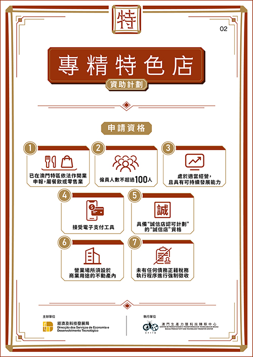 據介紹,是次資助計劃的對象為餐飲或零售業的中小企業,獲評定為“專精特色店”的中小企業,就其線上營銷、打造特色店面以及推出IP聯乘商品等指定費用,可獲六成資助,最高資助上限為15萬澳門元。有意申請的企業須具備“誠信店”資格,並提交自行擬訂的商業計劃書及經營方案。