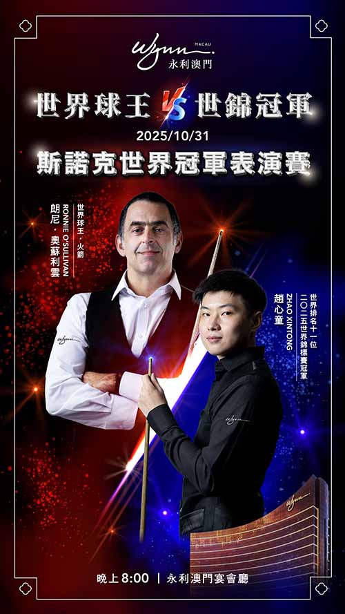 【本報訊】為支持特區政府“1+4”適度多元發展策略,以體育盛事推動體育與旅遊跨界融合,永利將於本月31日假永利澳門宴會廳舉辦“世界球王vs.世錦冠軍•斯諾克世界冠軍表演賽”。本次賽事特邀斯諾克傳奇球王——七屆世界錦標賽冠軍得主朗尼.奧蘇利雲(Ronnie O'Sullivan),與今年歷史性成為中國及亞洲首位斯諾克世錦賽冠軍的趙心童(Zhao Xintong)同場獻技,上演一場精彩絕倫的國際級斯諾克對決,為市民及旅客帶來難忘的體育盛宴。