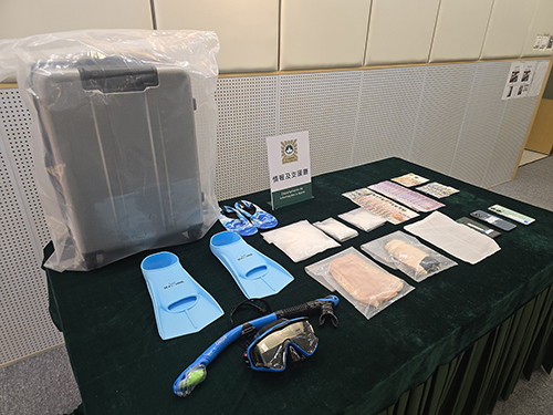 案情指,司警局持續貫徹“情報主導”方針打擊毒品犯罪,近日經轄下情報及支援廳分析情報發現有跨境販毒集團透過澳門國際機場作為中轉站運毒,隨即展開部署。本月2日早上,兩名涉案男子Tan及Goh攜帶毒品一同經港珠澳大橋口岸入境,之後再前往澳門機場,準備乘坐飛機離境。當疑犯Tan在機場辦理登機手續時,司警上前將其截獲,並在其隨身行李箱中檢獲3包不明物質,而行李箱內亦有蛙鞋、潛水鏡等物品,疑作為掩飾運毒之用。與此同時,另一名疑犯Goh在目睹同黨進入禁區後,準備離開機場時亦被司警拘捕。