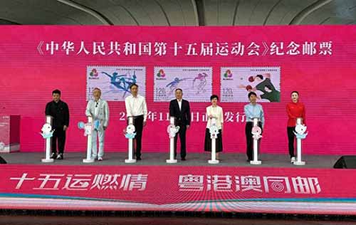 【本報綜合報道】《中華人民共和國第十五屆運動會》紀念郵票11月9日在廣州塔首發。紀念郵票一套3枚,並首次同步發行涵蓋內地、香港、澳門三地郵票元素的《中華人民共和國第十五屆運動會》三地小全張1枚。