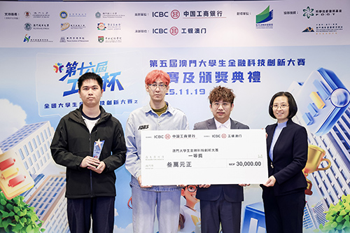 本賽事由9月到11月19日共歷時3個月,共有234名選手報名,提交作品85份,經過激烈角逐,最終16份作品成功入圍決賽。決賽中,來自澳門城市大學的翁傳振、李思墨、鄧淼鑫選手的作品《“青葵寶”──基於動態智能風控的青少年金融素養賦能平台》脫穎而出,成功斬獲一等獎;澳門科技大學的王蘊杰、鄭貽銘、高岳涵的作品《基於RDA的智慧畜牧資產金融化解方案》及澳門理工大學的吳楚慧、黃越、房君儀的作品《智審合規:合規智慧審查助手》獲得二等獎;復旦大學及清華大學的歐陽梓華、柯藍琪、何昊智的作品《QuantumFlow與跨境支付結算》,澳門城市大學的曾祺棕、岳新正、劉子涵的作品《灣區E企通──基於工行的粵港澳大灣區中小企業“跨境供應鏈貸款+結算”一體化平台》及澳門大學的任嘉浚、黎樂延的作品《結合LLM情緒分析的AI匯率預測與決策輔助系統》獲得三等獎。