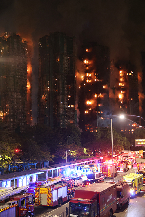 香港特區政府消防處副處長(行動)陳慶勇向傳媒介紹是次火災情況時表示,消防人員於昨日下午2時51分接報大埔宏福苑發生火災,隨後到場發現,火場面積27米乘21米,住宅大樓外圍均搭建了棚架進行維修。棚架起火後,大火迅速蔓延,不斷有著火的棚架和雜物從高空跌落。消防處收到的求助個案持續增加,下午6時22分,將此次火警升級為五級。此次行動中,消防處出動128輛消防車和57輛救護車,共出動767名消防救護人員。警方亦出動400人在現場進行疏散及外圍封鎖工作。 他指,火警升級源自燃燒的雜物及竹棚隨風勢蔓延至屋苑內7棟大廈,僅餘一座大廈未被波及,消防人員在未受波及的大廈內部開動消防喉,並到天台加強保護,同時向隔鄰大廈射水。