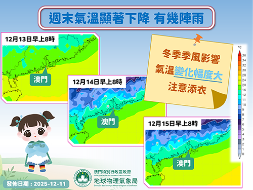 氣象局昨日發佈天氣特別推送消息指,昨日及今日受偏東氣流影響,日間天氣和暖,但隨著一道冷鋒明日抵達華南沿岸,本澳天氣漸轉多雲及有幾陣雨,當日晚間氣溫將顯著下降。而受冬季季風影響,週日至下週一(14日至15日)最低氣溫預料將下降至13℃左右,並伴隨4至6級偏北風。