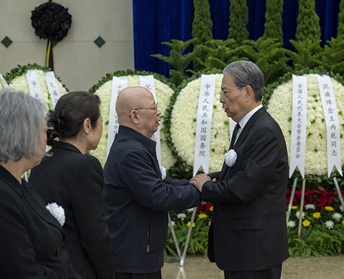上午9時許,趙樂際等在哀樂聲中緩步來到王丙乾同志的遺體前肅立默哀,向王丙乾同志的遺體三鞠躬,並與王丙乾同志親屬一一握手,轉達習近平總書記等中央領導同志的深切慰問。