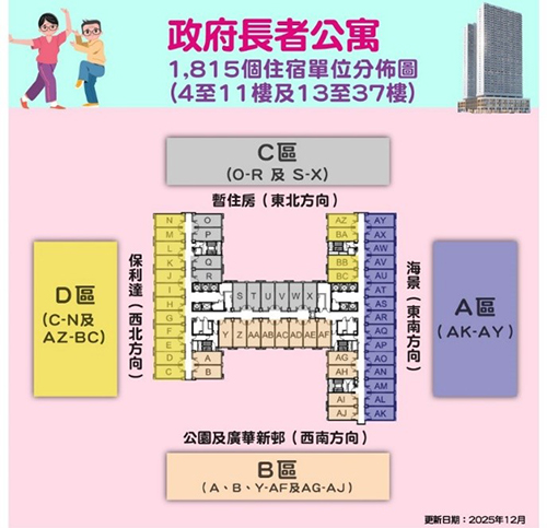 目前,長者公寓正恆常接受申請,反應較預期踴躍。據社會工作局公佈,為了讓合資格申請人在選擇單位時有更多選擇,長者公寓自2026年1月起加推餘下297個單位,包括C區(東北方向)的O至R單位及D區(西北方向)的J至N單位,屆時公寓各區不同座向尚未被選擇的單位全面開放選擇。