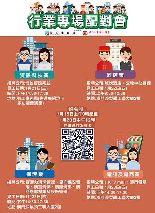 本月21日下午的資訊科技業專場配對會在澳門馬度博士大馬路221-279號先進廣場地下勞工局多功能會議室舉行;22日上午的酒店業專場配對會、下午的保潔業專場配對會和23日下午的電訊及電商業專場配對會,均在澳門沙梨頭海邊街2-6號工聯大廈二樓舉行。