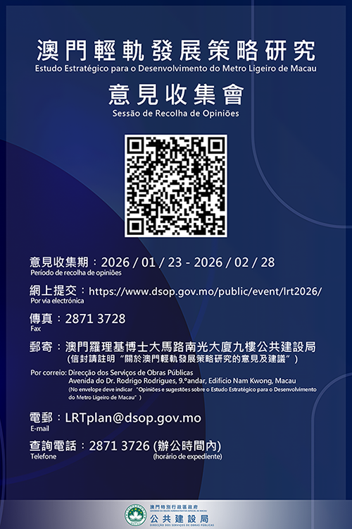 “澳門輕軌發展策略研究”意見收集期由2026年1月23日至2月28日止,公共建設局早前已分別於1月26日及27日舉辦了兩場專場會議,出席人員包括交通諮詢委員會委員、城市規劃委員會委員、環境諮詢委員會委員、社區服務諮詢委員會委員和建築業發展關注小組成員。