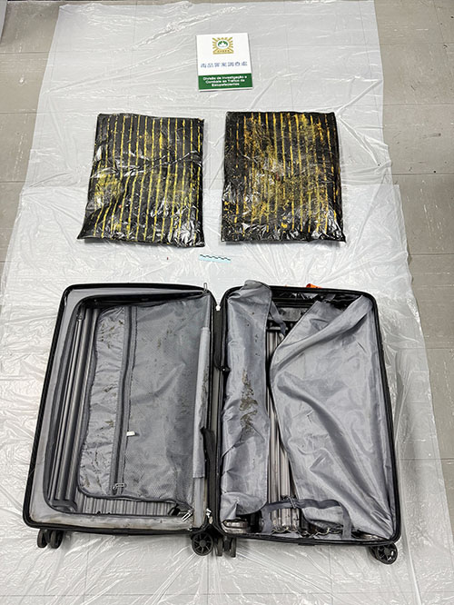 案情指,為加強打擊國際跨境販毒活動,司警根據情報結合風險排查,於日前得悉有販毒集團疑安排下線成員偷運毒品來澳,並鎖定一班於本月31日日間由國外飛抵澳門的航班上的可疑內地男乘客Kang。當嫌犯於當日飛抵本澳後,早已作出部署的司警在澳門海關及治安警配合下將其拘捕。警員將嫌犯的行李箱清空,發現行李箱重量異常,遂以工具割開箱內的兩側布料夾層,發現兩側各藏有一個膠袋,袋內裝著懷疑為毒品的乳白色顆粒,而膠袋表面沾有氣味刺鼻的辣椒油和咖啡粉,相信用作掩蓋毒品氣味,逃避警犬緝毒。