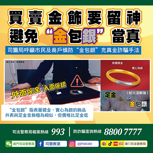 司警局發佈防騙小錦囊指出,購買金飾應選擇信譽商家,盡量選擇正規珠寶店購買,並保留好相關飾品及票據等購買憑證,以便日後核實;購買時務必看清標籤標識,金包銀通常不會刻有“999”或“24K”等足金標記;回收金飾時應進行嚴格查驗,切勿僅憑經驗、外觀或以往的信任省略驗金環節;莫貪圖便宜,如金價格遠低於市場價,極有可能是陷阱 ;倘懷疑遇到詐騙,應立即致電司警局防詐騙查詢熱線88007777或報案熱線993求助。