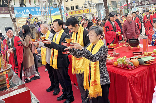 【本報訊】由康真君廟慈善會主辦,澳門道教協會、澳門海傍海邊街區坊眾互助會及澳門中華新青年協會協辦的“康公誕系列慶祝活動-康大真君聖尊出巡大典”於昨日上午10時在康公廟前地舉行。主辦單位冀透過活動弘揚中華宗教文化,促進澳門旅遊休閒業多元發展。