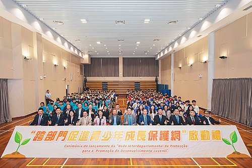 “跨部門促進青少年成長保護網”啟動禮於本月23日在高美士中葡中學舉行。教青局局長龔志明、副局長阮佩賢及黃嘉祺,澳門海關副關長李煜輝,法務局副局長邱顯哲,社會工作局副局長許華寶,警察總局局長辦公室顧問劉中志,衛生局仁伯爵綜合醫院代院長彭蓬光,治安警察局策劃行動廳廳長源劍鋒,司法警察局社區警務及公共關係處處長趙朱惠敏,消防局教育宣傳及公關處代處長黃思添,澳門中華教育會理事長鄭杰釗,澳門天主教學校聯會理事長劉麗妹,澳門高等教育發展促進會監事長仲偉合,以及治安警少年團、司警局滅罪小先鋒、海關守正之星、消防局救護小先鋒、法務局普法動力、教青局品德與公民推廣大使和學生代表共220人出席。