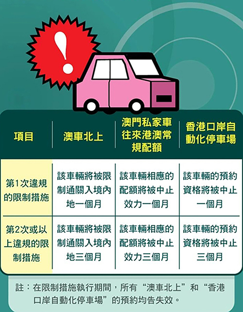 交通事務局早前以特區公報方式刊登“澳車北上”預約規則,同時修訂澳門私家車往來港澳常規配額應遵事項。按照規定,自今年3月15日起,如發現澳門車輛未有遵循“澳車北上”的預約規則進入內地,自查實確認後,首次違反,相關車輛將被限制通關入境內地一個月,續後的每次違反,相關車輛將被限制通關入境內地三個月,相關限制措施以連續方式執行,且將連帶影響違規車輛對於倘有使用“澳門私家車往來港澳常規配額”和“澳門私家車預約使用香港口岸自動化停車場服務”(詳情可查閱(https://www.dsat.gov.mo/dsat/news_detail.aspx?a_id=2AE190FA5120762050D8A7BD85B0FD57)。