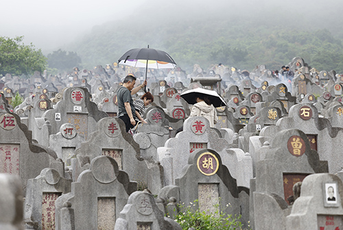 進入墳場,這裡一改往常清明節較為人多、充斥著香火味的情況,只有零星家庭在有蓋的骨灰龕區等待雨勢減弱。雨水在墓地區域的山坡湧下,水流湍急,未見有市民上山拜祭。墳場的清潔工告訴記者,當日來拜山的人明顯較往年清明節減少。