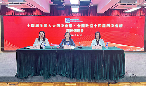 容永恩結合十四屆全國人大四次會議參會經歷,傳達大會核心精神,梳理發展、改革與創新、民生保障、消費、人工智慧、碳考核等關鍵字,分享對政府工作報告中對外政策、科技發展、綠色環保領域成果的體會;黃竹君聚焦兩會創新發展與教育相關議題,傳達國家科技自立自強、培育新質生產力的部署;黃潔貞圍繞全國政協十四屆四次會議精神,傳達國家“十五五”規劃綱要與澳門發展的契合點。