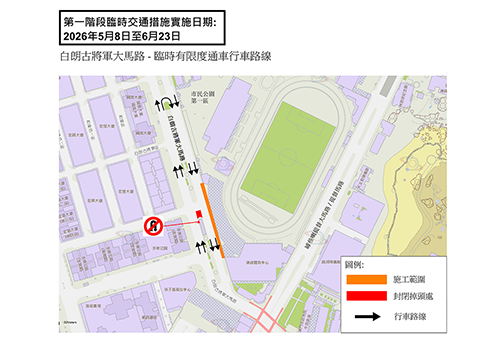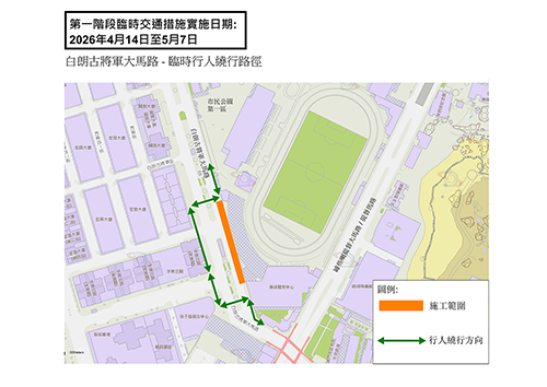 至於白朗古將軍大馬路有蓋行人通道方面,首階段施工由今日起至5月7日開展,期間近蓮峰體育中心一段行人路臨時封閉並建造有蓋行人通道,行人需以斑馬線繞行;同時,對開一段行車線實施有限度通車,掉頭處將臨時封閉。第二階段施工則由5月8日至6月23日進行,屆時受影響的行人路將完成建造並恢復通行,行車線亦恢復雙線行車,惟相關掉頭處維持臨時封閉。