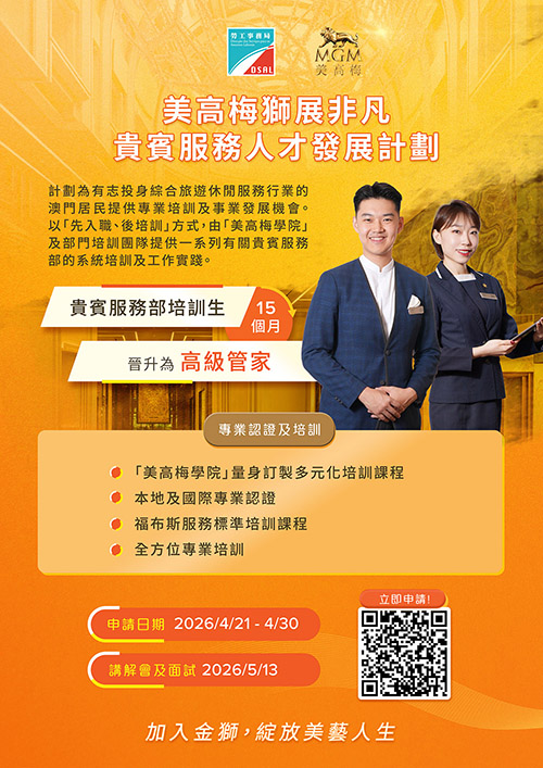如欲了解計劃詳情,可瀏覽勞工局網站內相關專頁(https://www.dsal.gov.mo/zh_tw/standard/mgm2026_pg1.html),有意參加者可於今日起至4月30日期間遞交網上申請。申請期結束後,美高梅將陸續通知符合條件的申請人出席5月13日舉行的講座及隨即安排面試,並向出席者詳細說明計劃的各項培訓內容及職業生涯發展路徑。