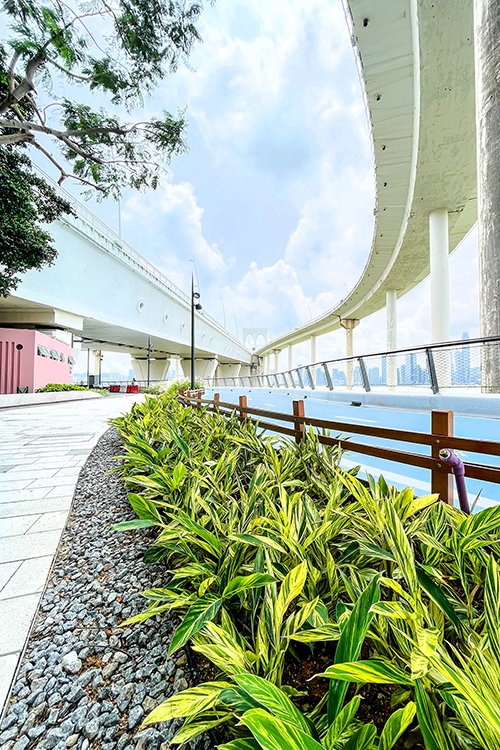 據市政署介紹,南岸海濱綠廊二期二區主要設有六百多米的沿海步道及單車徑,以綠化帶作分隔美化。單車徑兩側種植觀花樹種黃金雨,在盛開時可見枝條垂掛金色花串,猶如沉浸在金花瀑布之下;廊架種植蒜香藤,將會盛開粉紫色花朵,創設夢幻浪漫的氛圍;休憩空間則種植遮蔭效果較好的常綠樹種紅花玉蕊,為該區提供兼具觀花及遮蔭的效果。