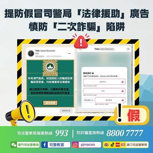 【本報訊】近日有騙徒在網上社交平台上冒用司法警察局名義發佈虛假“法律援助申請”廣告,內容聲稱“澳門已為因詐騙而遭受損失的市民啟動補償計劃”,藉此誘使市民點擊相關連結,並填報姓名及聯絡電話等個人資料。對此,司警局發出警情通告,提醒市民慎防相關廣告,避免遭受“二次詐騙”。