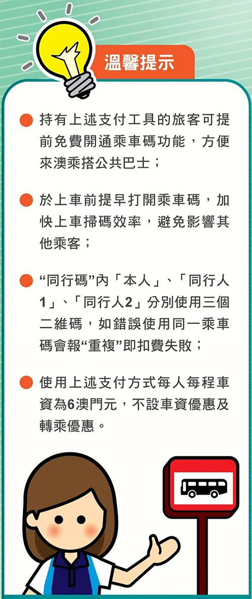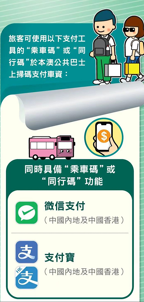 【本報訊】據交通事務局消息,為進一步便利公眾使用本澳公共巴士服務,加快乘客支付車資的速度,從而提升巴士運轉效率,交通事務局與金融管理局、巴士公司及支付機構持續溝通,開拓更多元的巴士電子支付方式。繼公共巴士於2月引入非本地支付工具增設“同行碼”功能後,經協調和測試,支付寶(中國香港)版本由昨日起亦新增“同行碼”功能,以便巴士乘客可同時額外支付兩名同行人士的車資。“同行碼”內“本人”、“同行人1”、“同行人2”分別使用三個二維碼,如錯誤使用同一乘車碼,會報“重複”,即扣費失敗。使用上述支付方式每人每程車資為6澳門元,不設車資優惠及轉乘優惠。